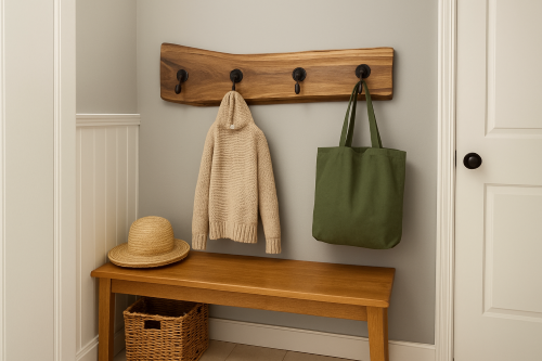 Add rustic charm and everyday function to your home with this handcrafted black walnut coat rack. Made from a solid slab of walnut, each rack highlights the wood’s natural live edge and rich grain patterns, making every piece truly one-of-a-kind.