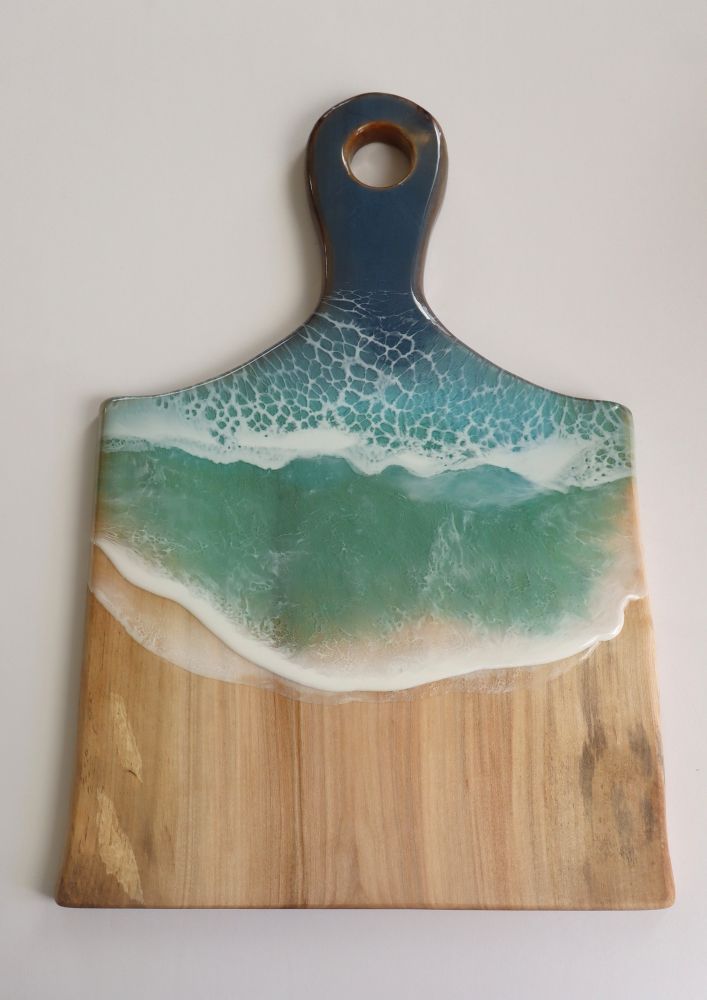Designed for both beauty and function, the resin artwork is sealed and finished for display, while the reverse side of the board can be used for cutting and food preparation.