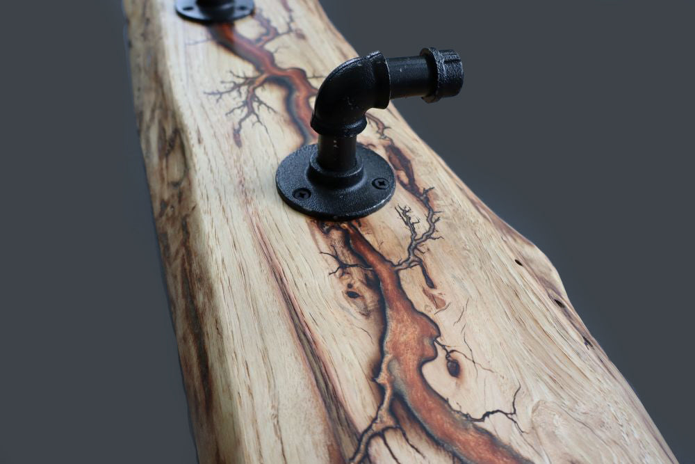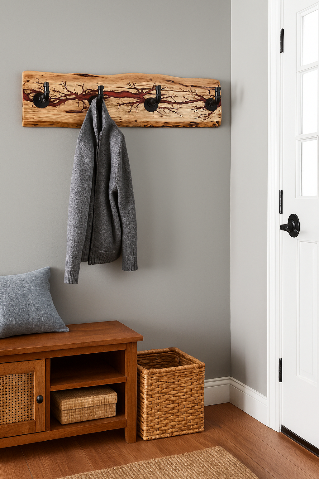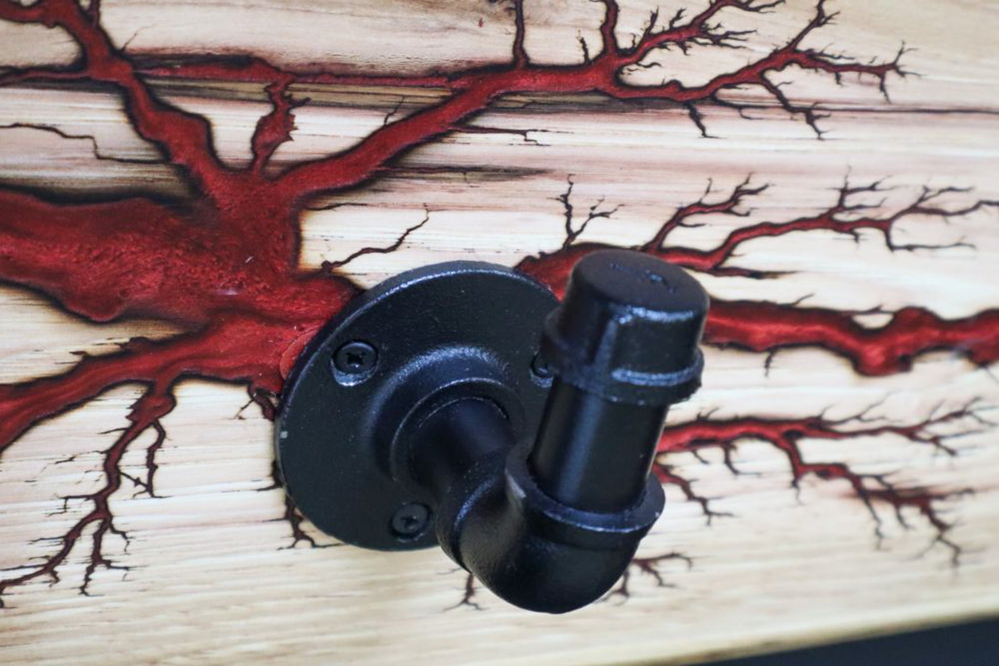 Bring rustic charm and industrial style to your home with this handmade live edge hickory coat rack. Featuring a bold Lichtenberg fractal burn design with color inlay, this piece is truly one-of-a-kind. Built with 4 heavy-duty black iron hooks, it’s perfect for coats, hats, bags, or scarves. Materials: Solid hickory wood + industrial iron hooks